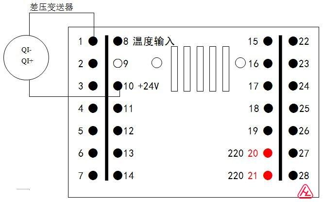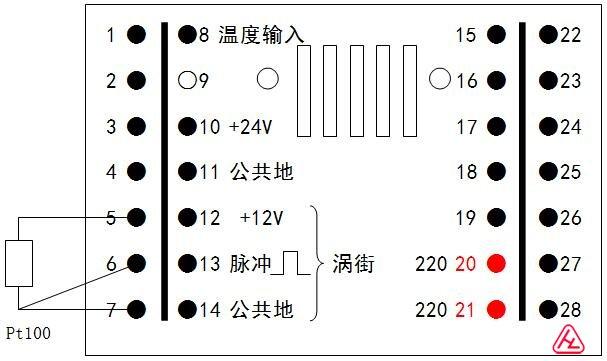 | 1.模擬流量信號(hào)輸入;2.流量再發(fā)送電流輸出;3.RS-485,A;4.RS-485,B;5.Pt100,A;6.Pt100,B;7.Pt100,B;8. 溫度電流信號(hào)輸入;9. 空;10. 24V; | 11.公共地(GND);12. 12V;13.脈沖流量信號(hào)輸入;14.公共地(GND);15.發(fā)料啟動(dòng)按鈕;16.發(fā)料停止按鈕;17.清零/復(fù)位按鈕;18.按鈕公共接點(diǎn);19.接大地;20.220V; |