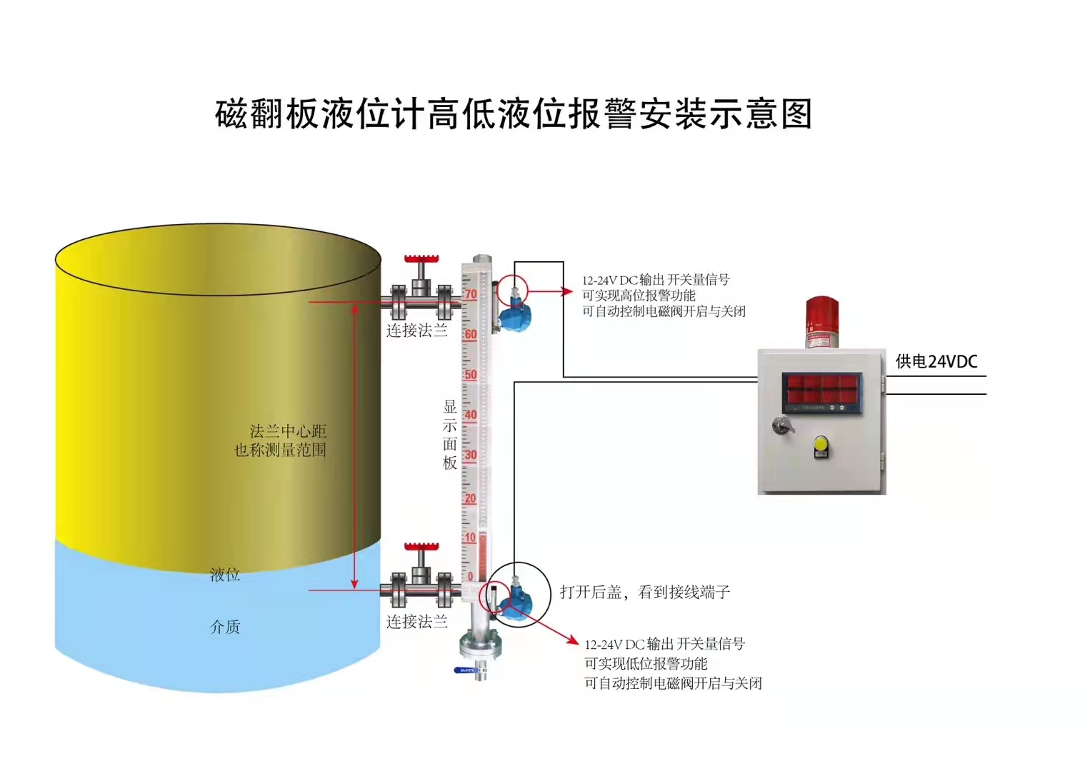 磁翻板液位計**用于各種儲罐和容器的液位測量。與其它液位計相比,磁翻板液位計具有結(jié)構(gòu)簡單、維護(hù)方便、觀察直觀等優(yōu)點。磁翻板液位計以磁浮子為傳感元件,根據(jù)浮力原理和磁耦合原理制成。通過磁翻板液位計可直接觀察容器內(nèi)液位的實際高度,測量管內(nèi)的浮子隨測量液位的變化量相等。當(dāng)被測容器中的液位上升和下降時,液位計本體管中的磁浮子也會上升和下降。浮子中的永磁鋼通過磁耦合傳輸至磁翻板指示器,將驅(qū)動紅,白色翻板翻轉(zhuǎn)180°。當(dāng)液位下降時,翻板由紅色變?yōu)榘咨?,?dāng)液位上升時,翻板由白色變?yōu)榧t色,容器內(nèi)液位的實際高度為指示器的紅白交界處,為了實現(xiàn)液位的清晰指示