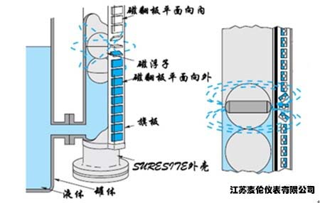 防腐磁性翻板液位計的設(shè)計原理與基本磁翻板液位計。它們都是利用現(xiàn)場連接器和磁耦合機(jī)構(gòu)實時測量油位。當(dāng)被測容器內(nèi)的油位升高時,浮桶內(nèi)的磁浮子也升高,浮子內(nèi)的無限磁鋼通過磁耦合控制器根據(jù)浮桶外的磁翻板旋轉(zhuǎn)180°,翻板的兩側(cè)涂有不同顏色(通常為藍(lán)色和黑色)以標(biāo)記油位的位置。通常,當(dāng)容器中的油位升高時,活門從黑色變?yōu)樗{(lán)色。當(dāng)容器中的油位降低時,活門從藍(lán)色變?yōu)楹谏V甘酒鞯陌咨图t色的交點是容器內(nèi)油位的具體高寬比,以實現(xiàn)油位的精確測量。工作原理圖如圖所示。