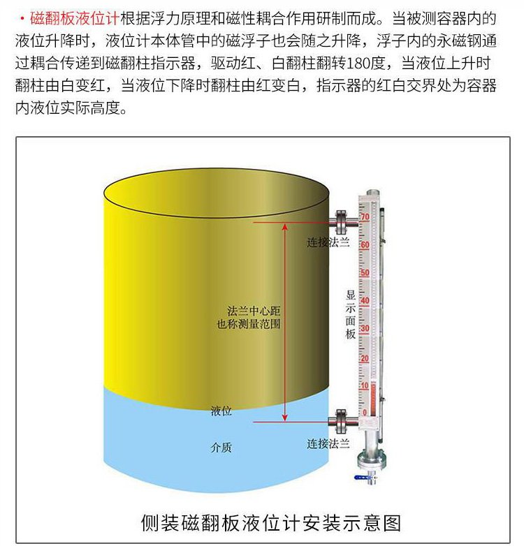 磁翻板液位計的基本知識;磁翻板液位計又稱磁翻板液位計、磁翻板柱液位計和磁浮子液位計。它基于磁耦合原理工作,彌補(bǔ)了玻璃管液位計在高溫高壓下不能工作且易碎的諸多缺點(diǎn);磁翻板液位計有兩種安裝方式:側(cè)裝和頂裝。無論采用哪種方式,都可以捆綁遠(yuǎn)程傳輸裝置,以便液位計可以在本地顯示液位,并遠(yuǎn)程監(jiān)控液位。