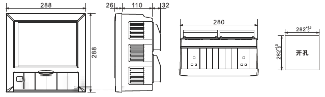 注:JSML-3000 40通道彩色無紙記錄儀通用輸入數(shù)+頻率輸入+傳動輸出+PID控制輸出≤40。四十通道彩色無紙記錄儀儀表外形尺寸、安裝方法及開口尺寸。開口尺寸:282×282彩色無紙記錄儀尺寸圖。40通道彩色無紙記錄儀接線方式。彩色無紙記錄儀的連接方式。彩色無紙記錄儀接線圖。