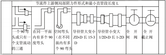 (2)節(jié)流件前后要求一段足夠長的直管段,這段足夠長的直管段和節(jié)流件前的局部 阻力件形式有關(guān)和直徑比B有關(guān),見表1 (B=d/D,d為孔板開孔直徑,D為管 道內(nèi)徑)。