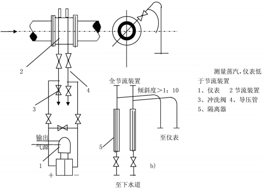 測量蒸汽流量時,安裝方式一般為差壓變送器低于、高于節(jié)流裝置兩種。取壓口位置應(yīng)附合上述安裝要求,并在導(dǎo)壓管制高點處裝上放氣閥和氣體收集器。