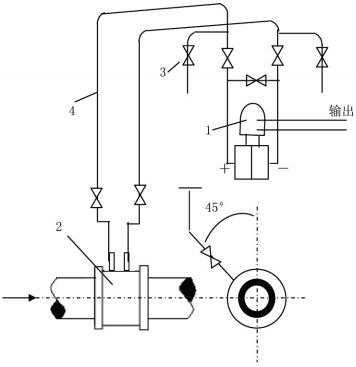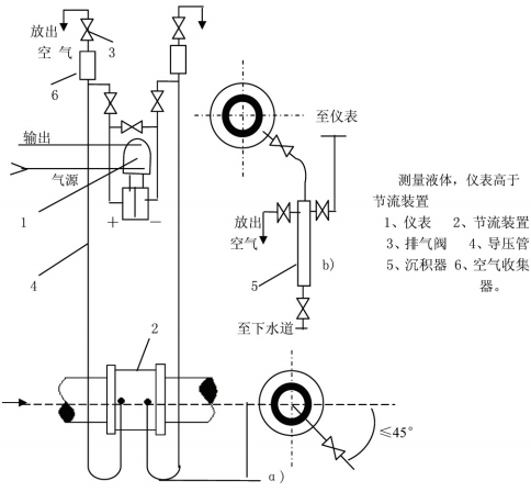 測量液體流量時工藝管道水平安裝,差壓變送器的位置 處于節(jié)流裝置下方時,取壓口應(yīng)在節(jié)流裝置的水平中心 軸線下偏45°角引出,這可以消樣除由流體傳放出的氣體進入導(dǎo)壓管和差壓變送器。若差壓變送器處于節(jié)流裝置的上方時,除取壓口下偏<45°角然后向 上引導(dǎo)壓管外,應(yīng)在導(dǎo)壓管 上的*高點裝置集器或排氣閥。