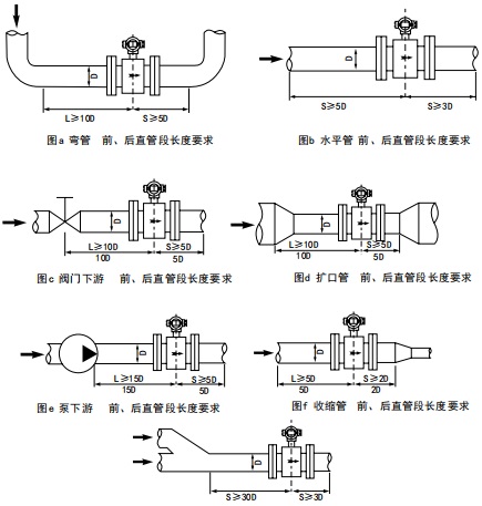 為了改善渦流與流場畸變的影響,流量計安裝的前、后直管段長度有一定要求,否則會影響測量精度(也可安裝整流器,盡量避免在靠近調節(jié)閥和半開閥門之后安裝)。