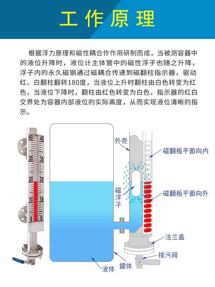 液位計根據(jù)浮力原理,浮子在測量管內(nèi)隨液位的升降而上、下移動,浮子內(nèi)的*磁鋼通過磁耦合作用,驅(qū)動紅、白色翻柱翻轉(zhuǎn) 180 。 液位上升時,翻柱由白色轉(zhuǎn)為紅色,下降時由紅色轉(zhuǎn)為白色,從而實(shí)現(xiàn)液位的指示。