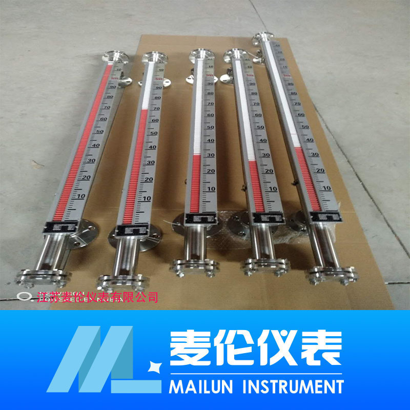 產(chǎn)品原理基本型液位計根據(jù)浮力原理,浮子在測量管內(nèi)隨液位的升降而上下移動,浮子內(nèi)的磁鋼通過磁耦合作用,驅(qū)動紅、白色翻柱翻轉(zhuǎn)180°。液位上升時,翻柱由白色轉(zhuǎn)為紅色,下降時由紅色轉(zhuǎn)為白色,從而實現(xiàn)液位的指示。上下限開關(guān)輸出利用磁性浮子隨液位的移動,使安裝在液位計立管設(shè)定位置的報警開關(guān)動作,實現(xiàn)ON-OFF控制或報警。電遠傳在磁翻板液位計上安裝變送器。變送器由傳感器和轉(zhuǎn)換器兩部分組成,它通過磁浮子上下移動,經(jīng)磁耦合作用使導(dǎo)管內(nèi)測量測量元件依次動作,獲得電阻信號變化,轉(zhuǎn)換成4~20mA的標(biāo)準(zhǔn)電流信號輸出,以便與數(shù)字顯示儀表或計算機連接,實現(xiàn)遠傳顯示。